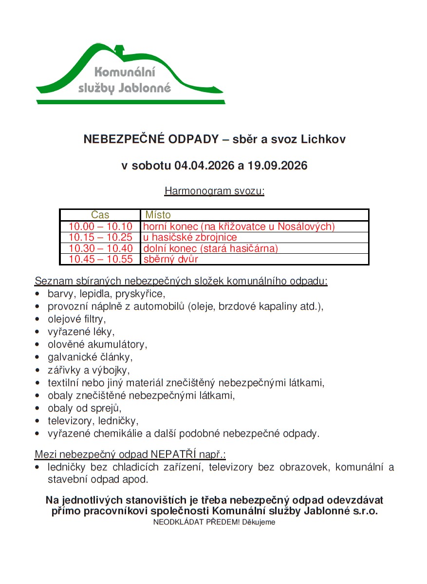 Úvod > Obec > Aktuality > Sběr a svoz nebezpečných odpadů - duben 2026